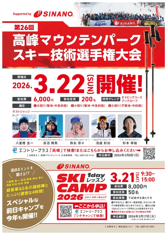 長年続く伝統のスキー技術選、第26回大会として、2026年3月22日(日)に高峰マウンテンパークで開催されます。